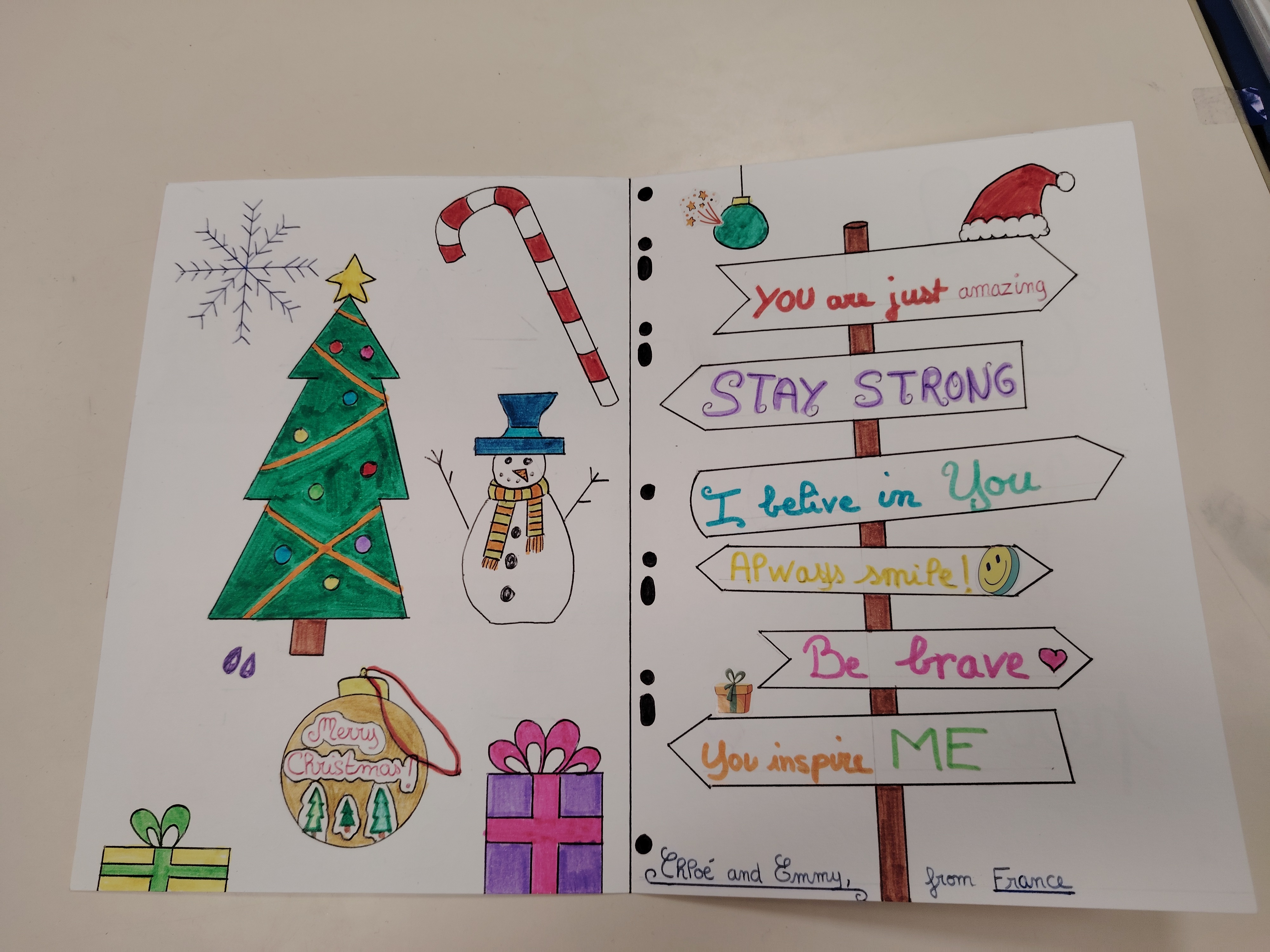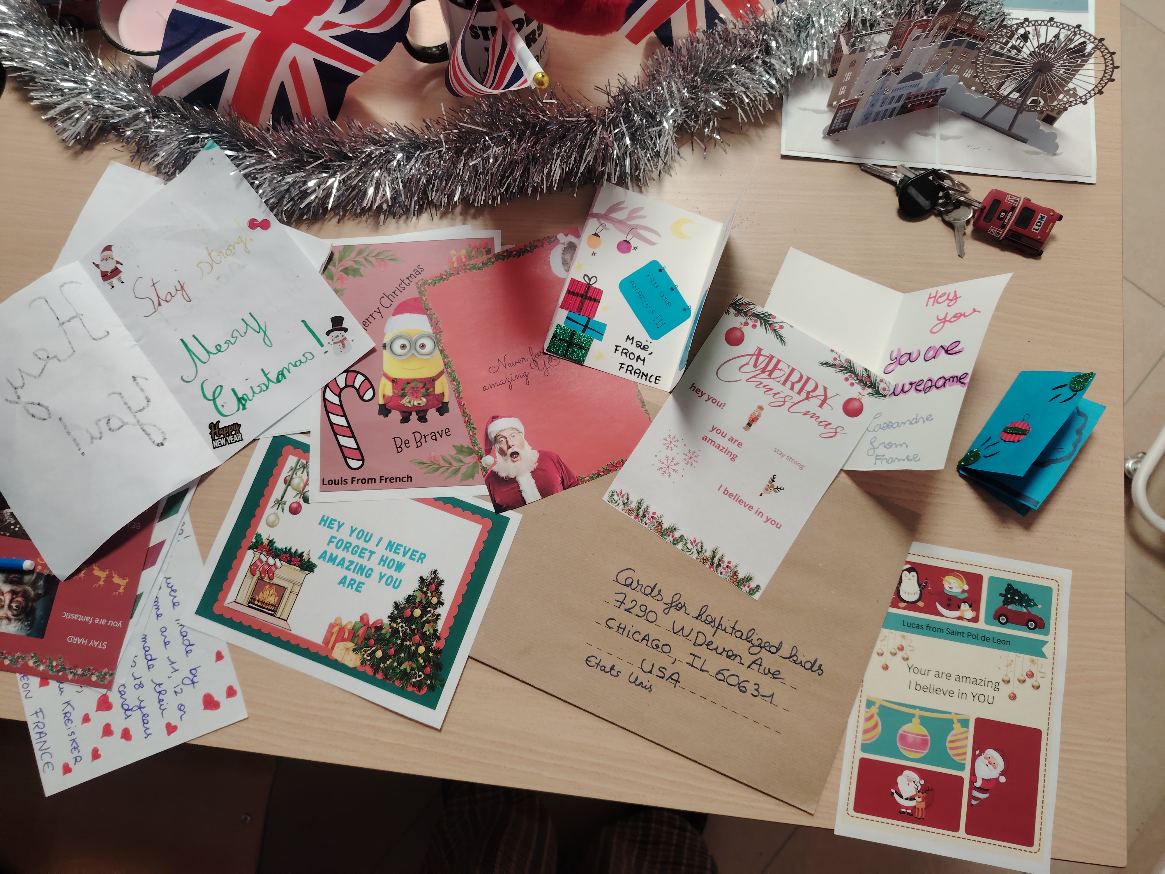 Les élèves se sont investis et ont été très touchés par le sort des enfants qu’ils ont découverts via une vidéo de présentation sur l’origine de l’association “cards for hospitalised kids”. Ils espèrent que leurs cartes apporteront un peu de force pour les fêtes, un souffle d’espoir venant de Saint Pol de Léon vers de nombreux hôpitaux aux USA. C’est la première année que ce projet voit le jour pour ces élèves, et Madame Goalès espère que chaque année d’autres cartes seront postées en anglais.