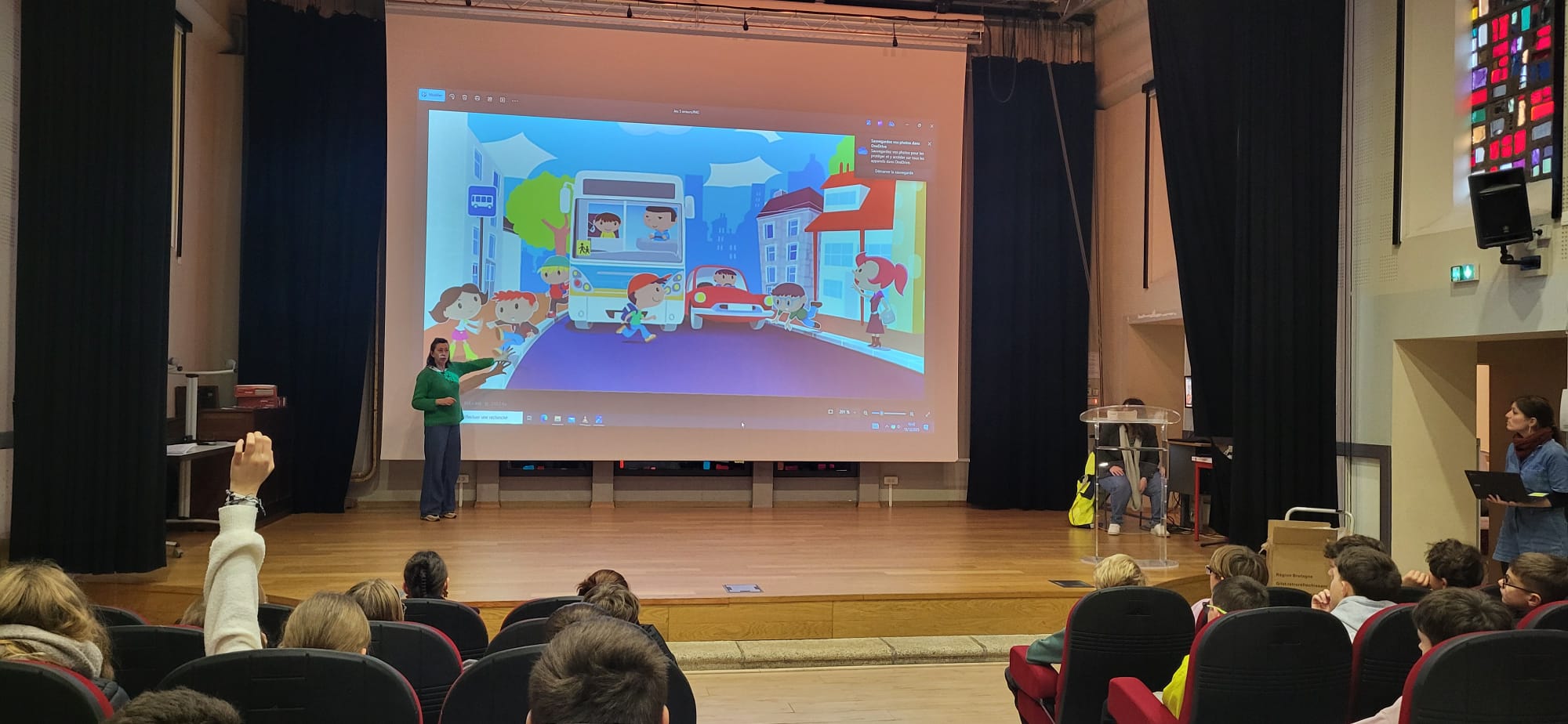 Une première partie théorique en salle, durant laquelle les élèves ont assisté au visionnage de courts films pédagogiques. Ces supports ont permis de rappeler les règles essentielles de sécurité et les bons comportements à adopter lors des trajets en car.