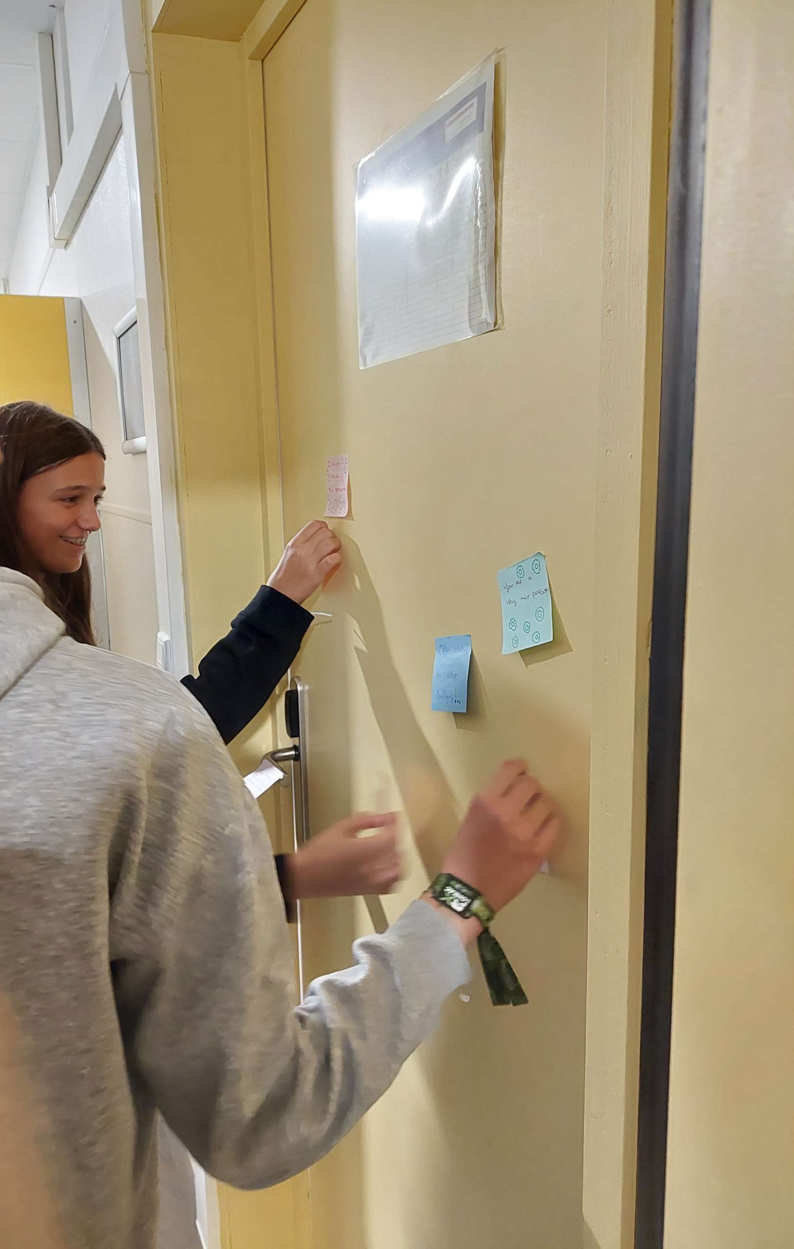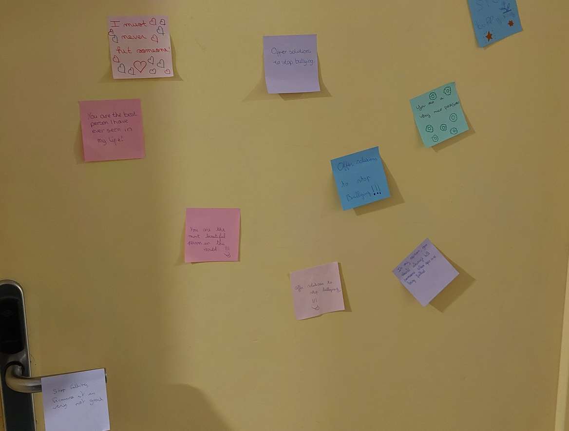 L’objectif de leur projet était de coller, à l’aide de post-its colorés, plusieurs messages bienveillants et préventifs contre le harcèlement scolaire dans les couloirs du bâtiment B2 (celui des 4èmes et des 3èmes) afin de sensibiliser leurs camarades. À leur sortie de classe, les élèves et enseignants ont donc pu découvrir des messages colorés postés un peu partout.