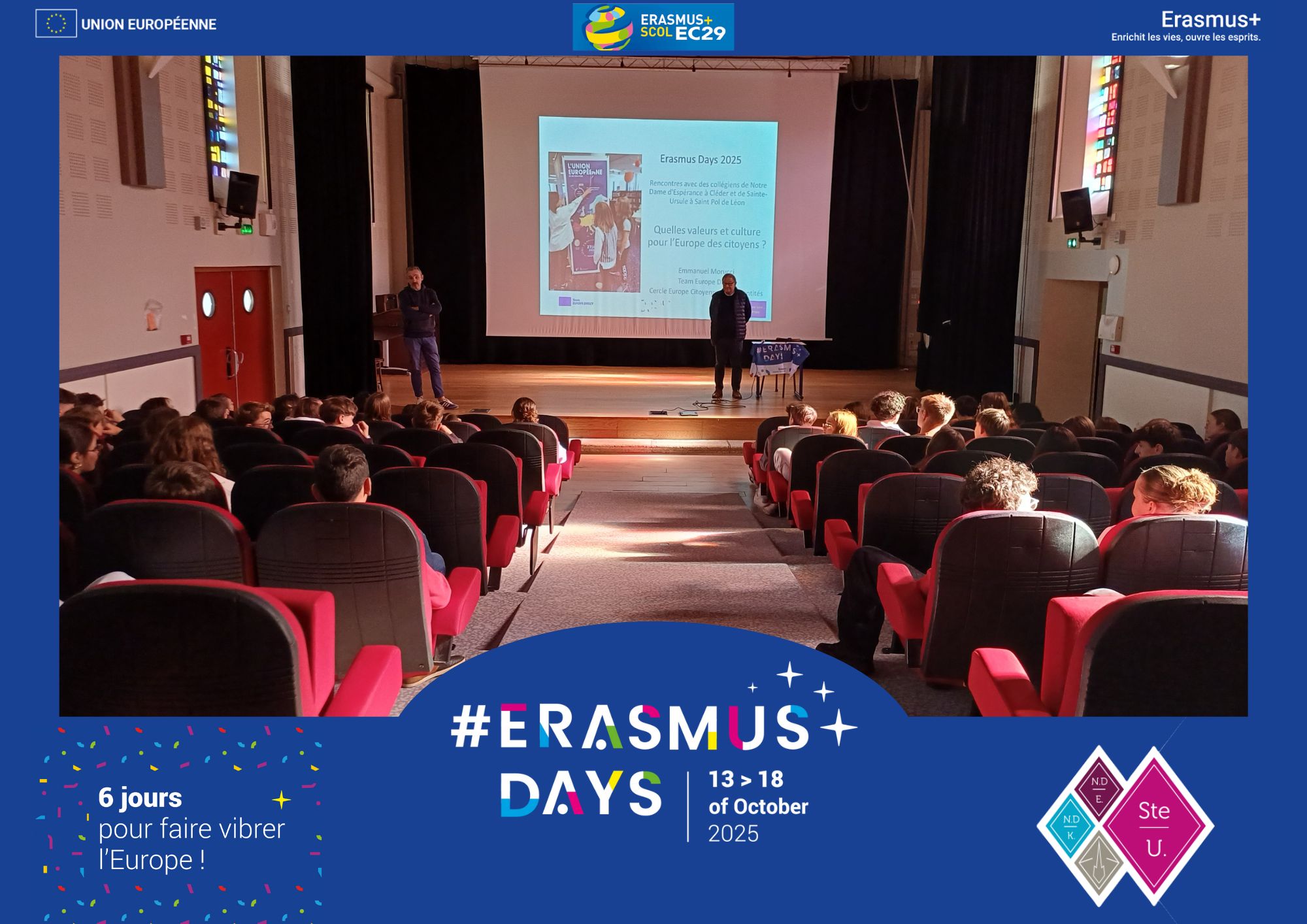Les collèges Sainte-Ursule (SU) et Notre-Dame d’Espérance (NDE) ont organisé une conférence captivante jeudi 16 octobre, entièrement dédiée à la citoyenneté européenne et au sentiment d’appartenance. Les 3ème ont eu le privilège d’assister à cet échange enrichissant pendant 50 minutes.