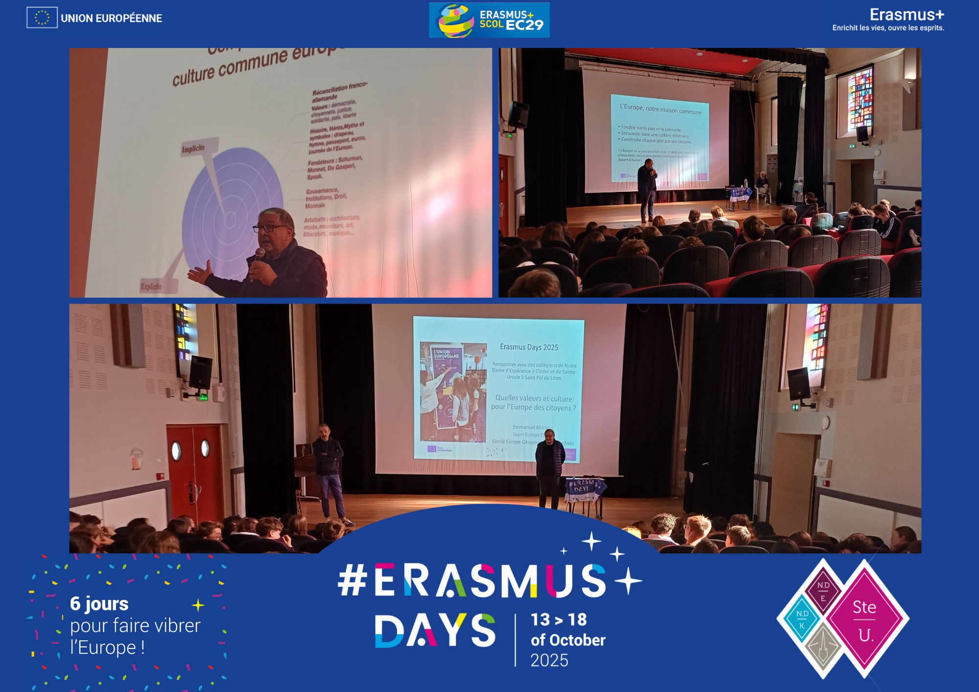 Les collèges Sainte-Ursule (SU) et Notre-Dame d’Espérance (NDE) ont organisé une conférence captivante jeudi 16 octobre, entièrement dédiée à la citoyenneté européenne et au sentiment d’appartenance. Les 3ème ont eu le privilège d’assister à cet échange enrichissant pendant 50 minutes.