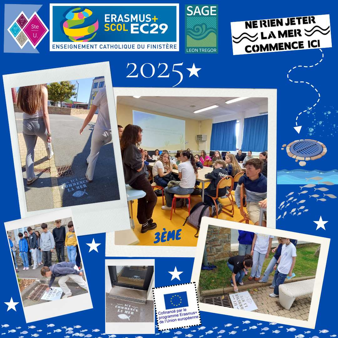 Dans le cadre de leur projet Erasmus “La Mar de Europeos”, les élèves de 3e 2 et 6 du collège ont lancé une campagne de sensibilisation “Ici commence la mer”. Ils ont apposé environ 20 tags près des avaloirs dans le collège et ses alentours. En collaboration avec le SAGE du Pays de Morlaix, des intervenantes ont expliqué le trajet des déchets de la terre à la mer. En amont de cette activité, les élèves espagnols et français, avaient fait des posters pour sensibiliser les élèves de deux collèges à cette cause.