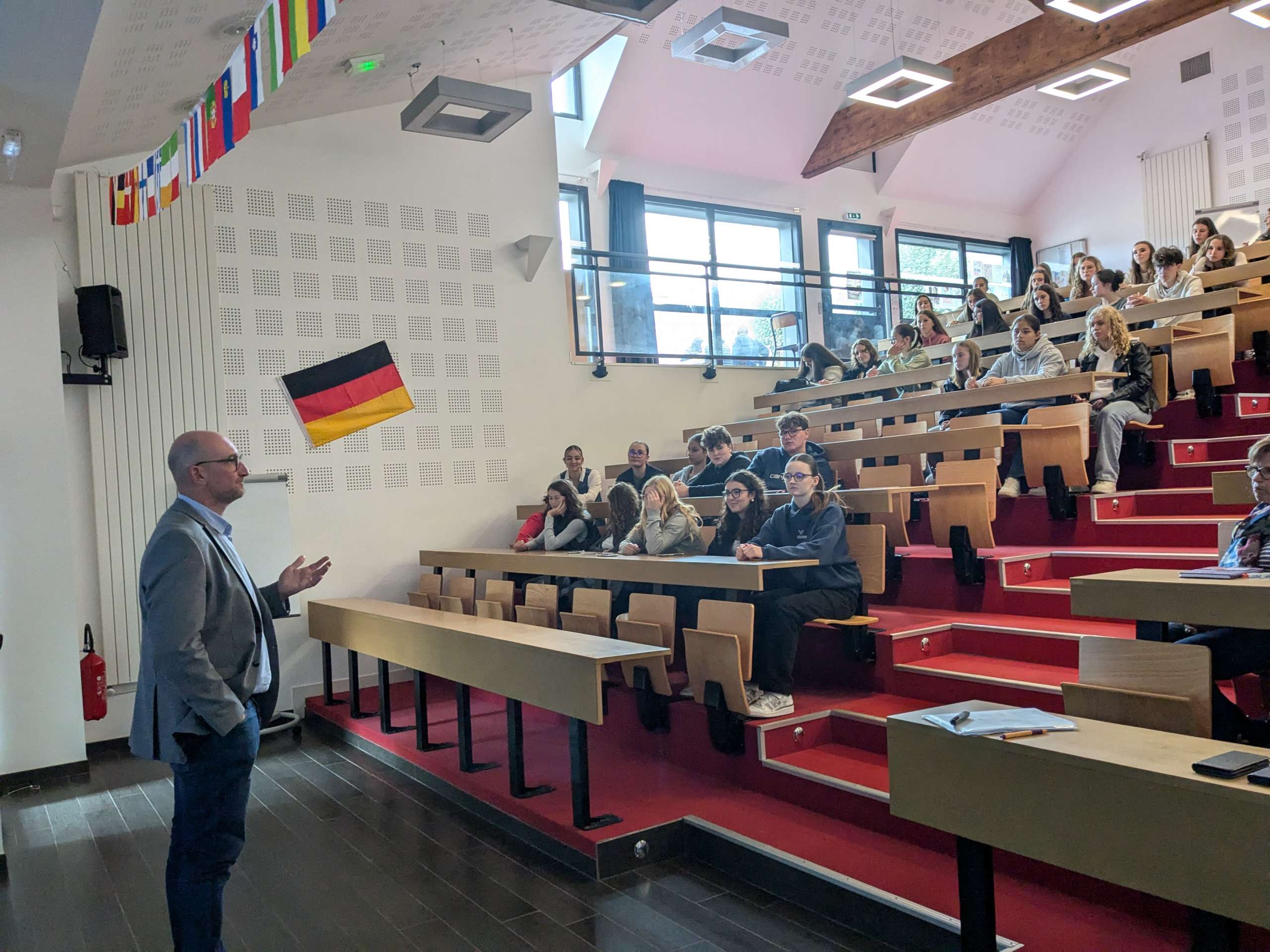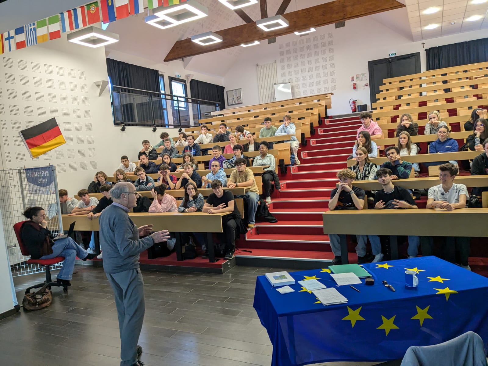 Jeudi 17 octobre, les lycéens ont eu le plaisir d’accueillir François-Xavier Camenen, Président de la Maison de l’Europe du Morbihan, pour une conférence passionnante intitulée “Naissance de l’Europe, son évolution, la monnaie unique, la libre circulation et le fonctionnement actuel de l’Union européenne”. Les élèves ont pu approfondir leurs connaissances sur les fondements de l’UE, son histoire, l’introduction de l’euro, et les principes de libre circulation des personnes et des biens entre les États membres. Un grand merci à M. Camenen pour cette intervention enrichissante qui a permis à nos élèves de mieux comprendre les enjeux européens actuels !