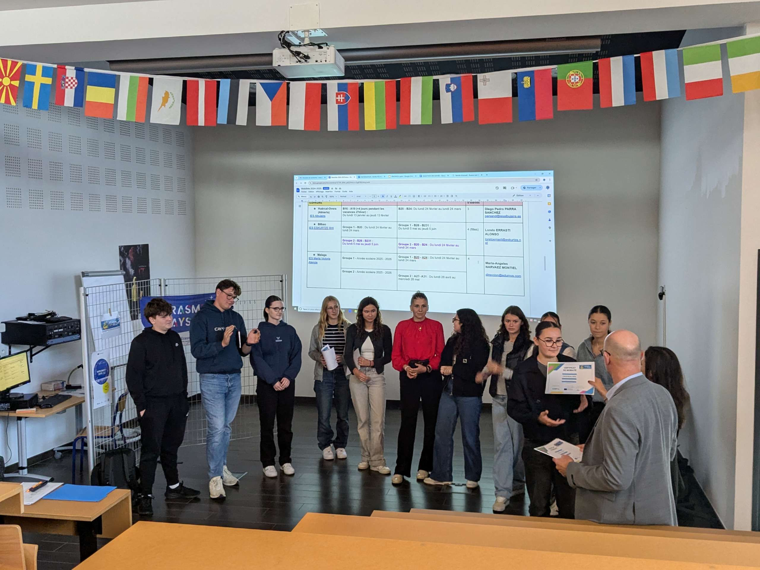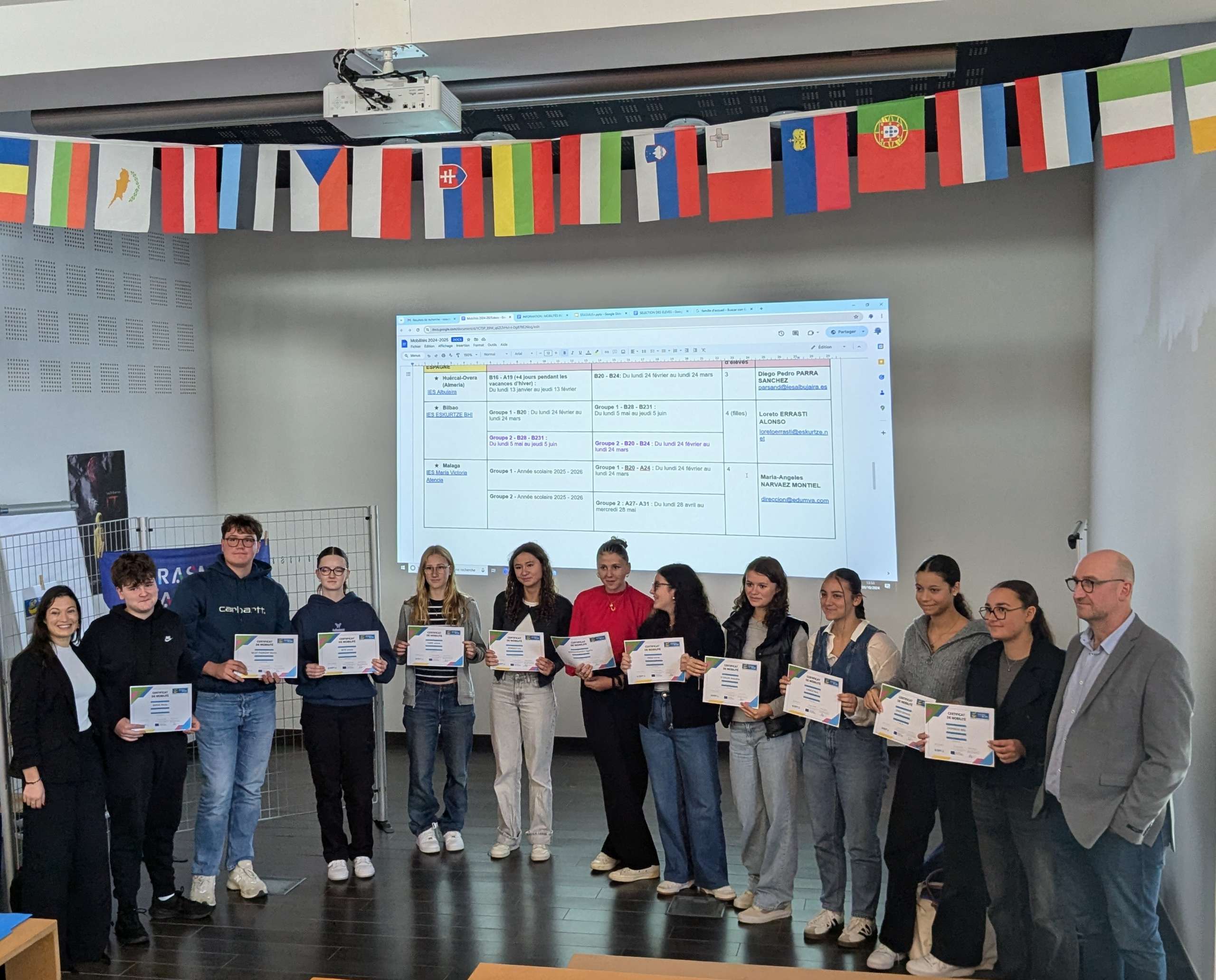 Pour anticiper cet événement, nous avons eu le plaisir d’accueillir M. COCAIGN, chargé de mission pour l’Europe et l’international, qui a présenté, aux élèves de 2ndes intéressés, les avantages, les opportunités et les modalités pour obtenir une bourse de mobilité à l’étranger. Plus de cinquante élèves motivés sont venus assister à cette première réunion, où les anciens élèves ayant effectué une mobilité individuelle se sont présentés comme ambassadeurs, prêts à accompagner leurs camarades dans toutes les démarches. À la fin de cette rencontre, les participants ont reçu les diplômes attribués par la DDEC du Finistère, un atout pour leur dossier Parcoursup.