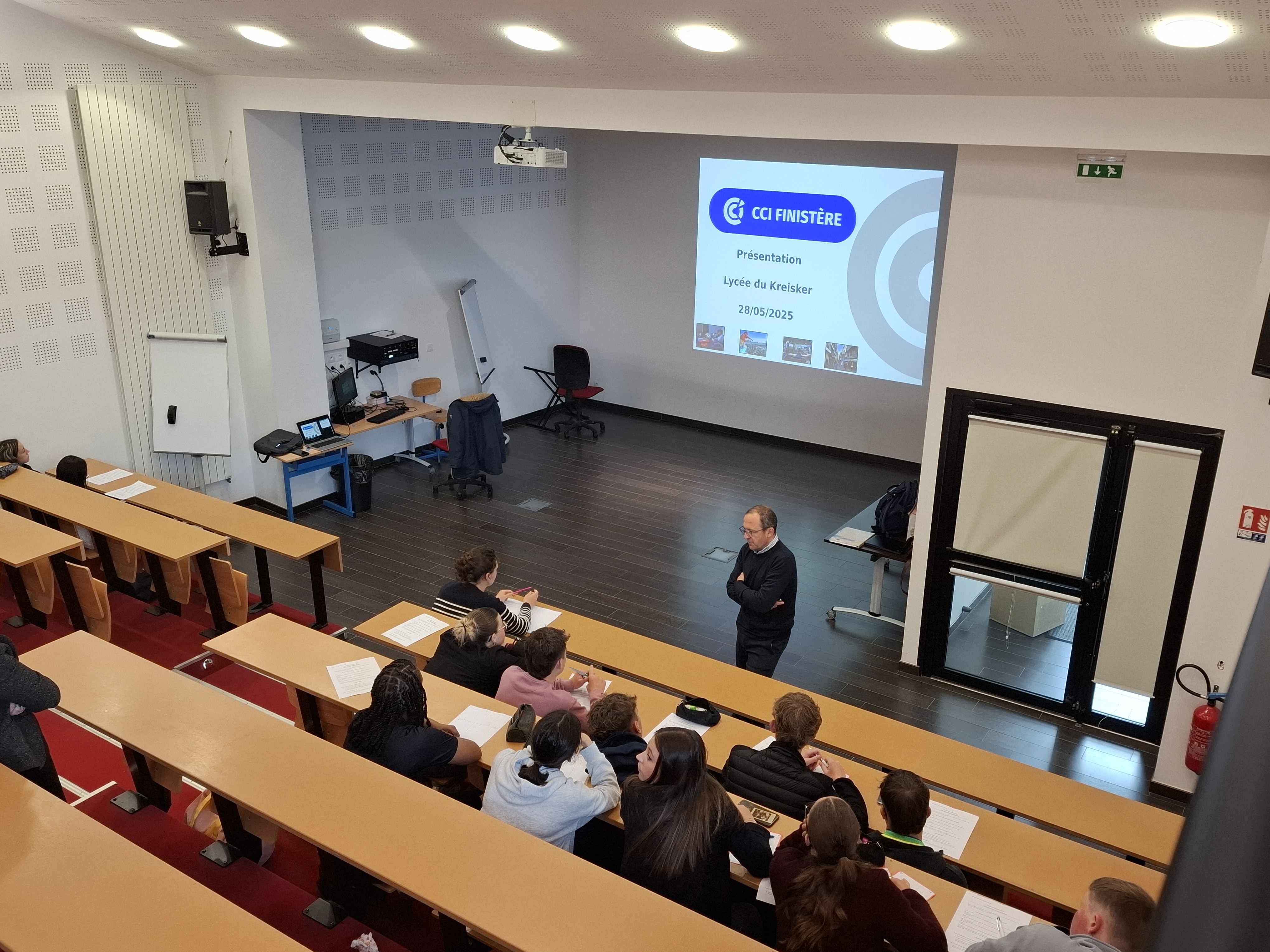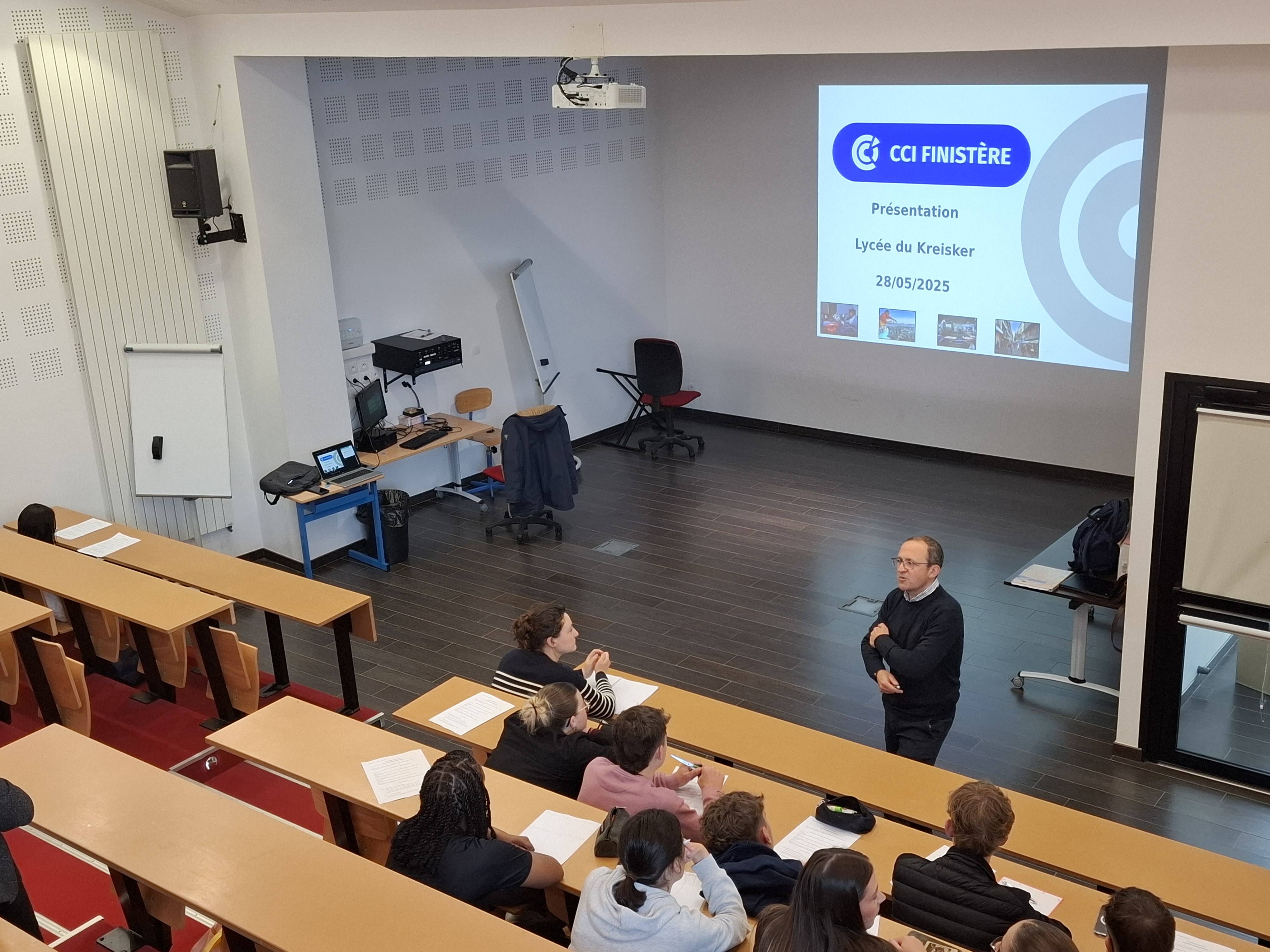 Nous remercions chaleureusement M. Boussard, représentant de la CCI du Pays de Morlaix, pour sa venue et sa présentation au lycée en ce mercredi matin. Nous saluons également la présence de sa stagiaire, ancienne élève de notre établissement, actuellement en DUT GACO à l’IUT de Morlaix et en stage de six semaines à la CCI.