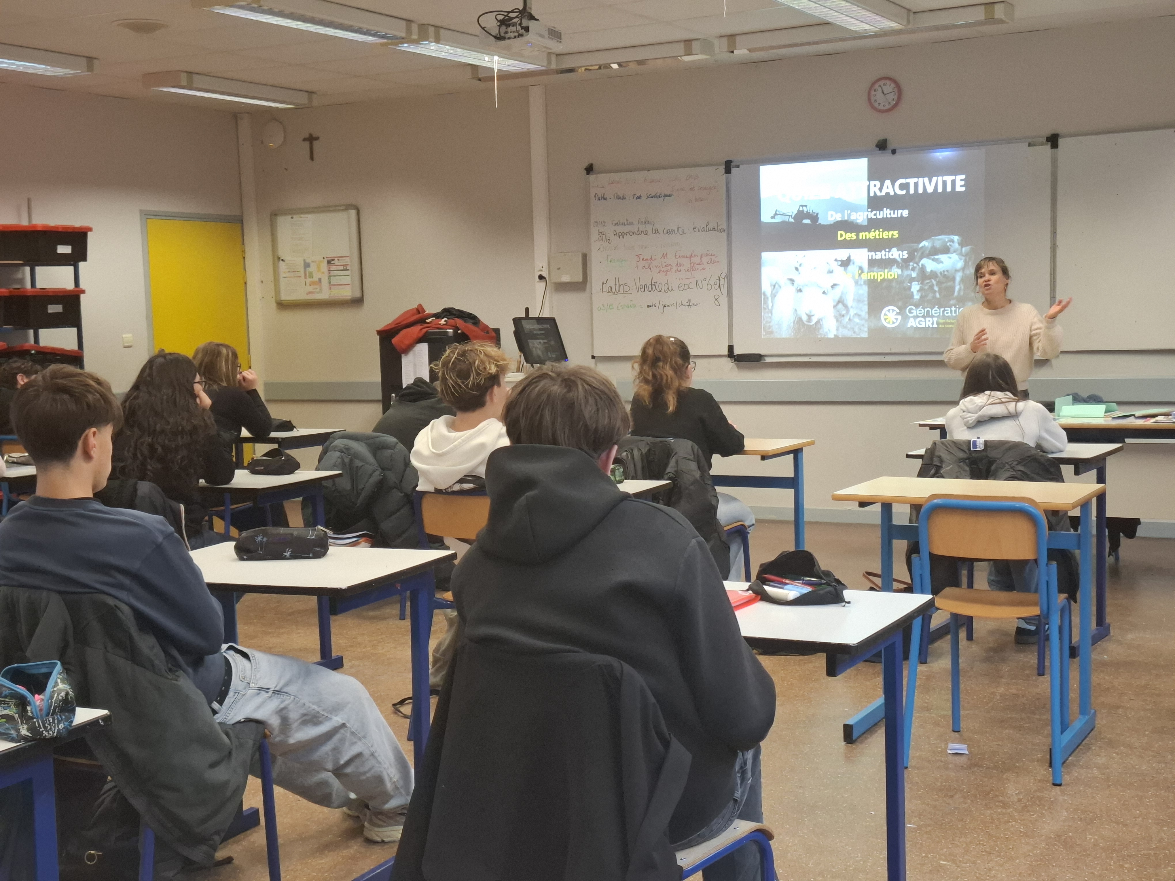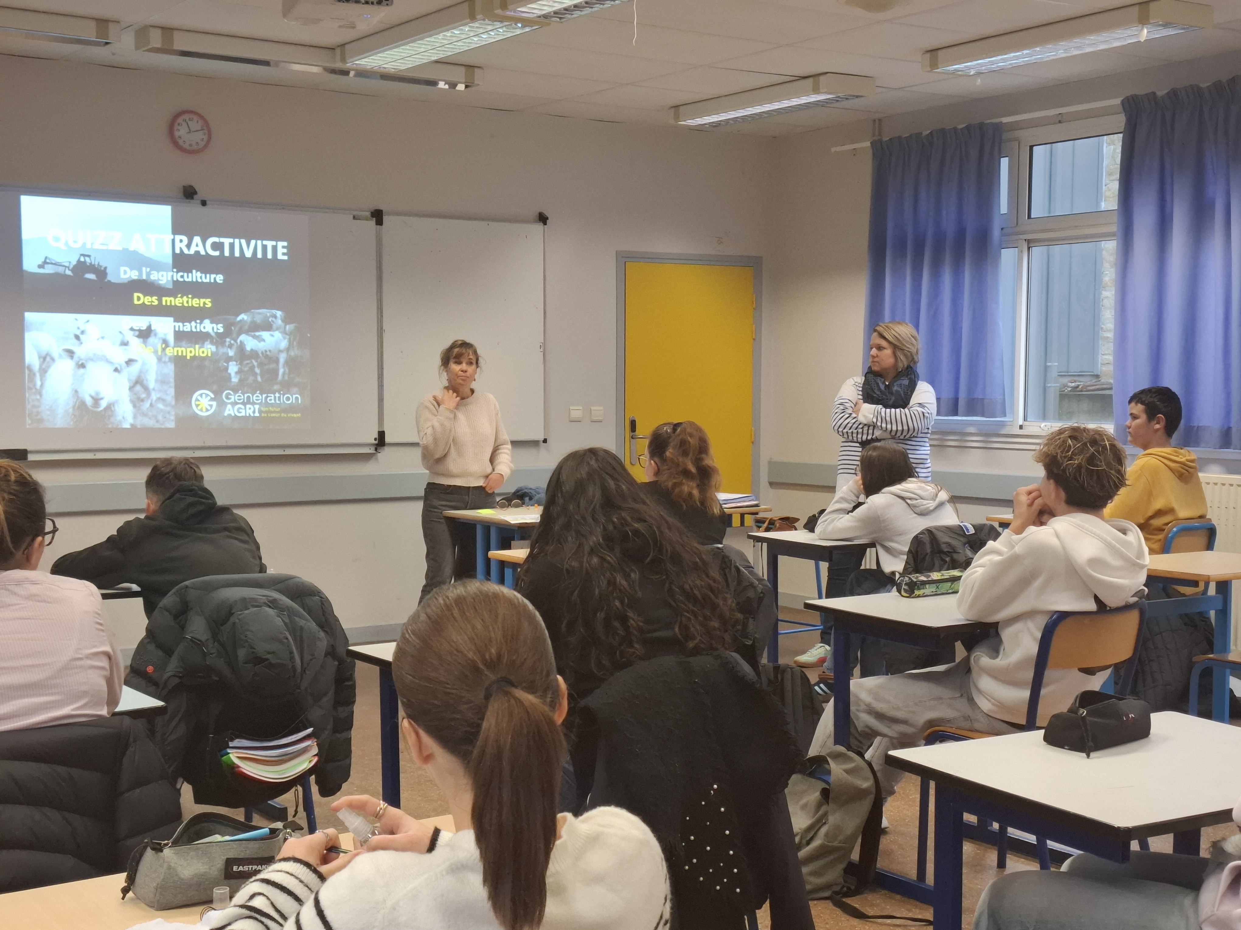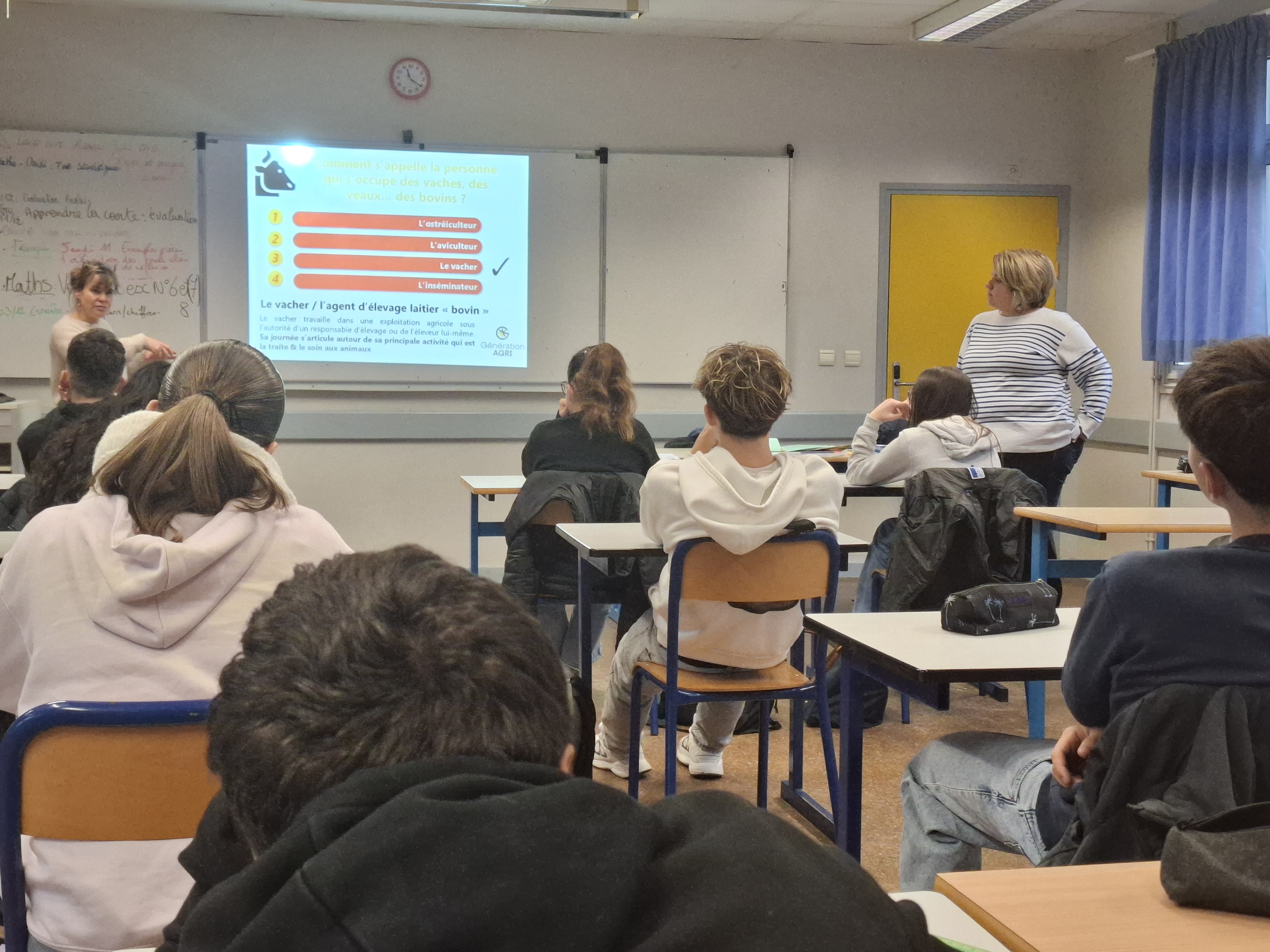 Les élèves de 3ème PM ont accueilli, ce mardi 9 décembre, Mme Dupont (de la Chambre d’agriculture du Finistère : coordonnatrice Génération Agri Finistère) et Mme Kerbrat (Référente à la Chambre d’agriculture et chef d’exploitation agricole à Taulé), venues présenter la richesse des métiers liés au secteur agricole.