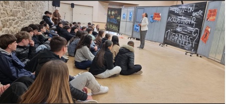 Les élèves ont travaillé en amont en classe dans le cadre du programme en géographie, EMC et EMI. Un temps d’échange a été prévu en bord de scène après le spectacle, puis en classe avec les enseignants avec Mme Guiho, de l’antenne morlaisienne d’Amnesty international.