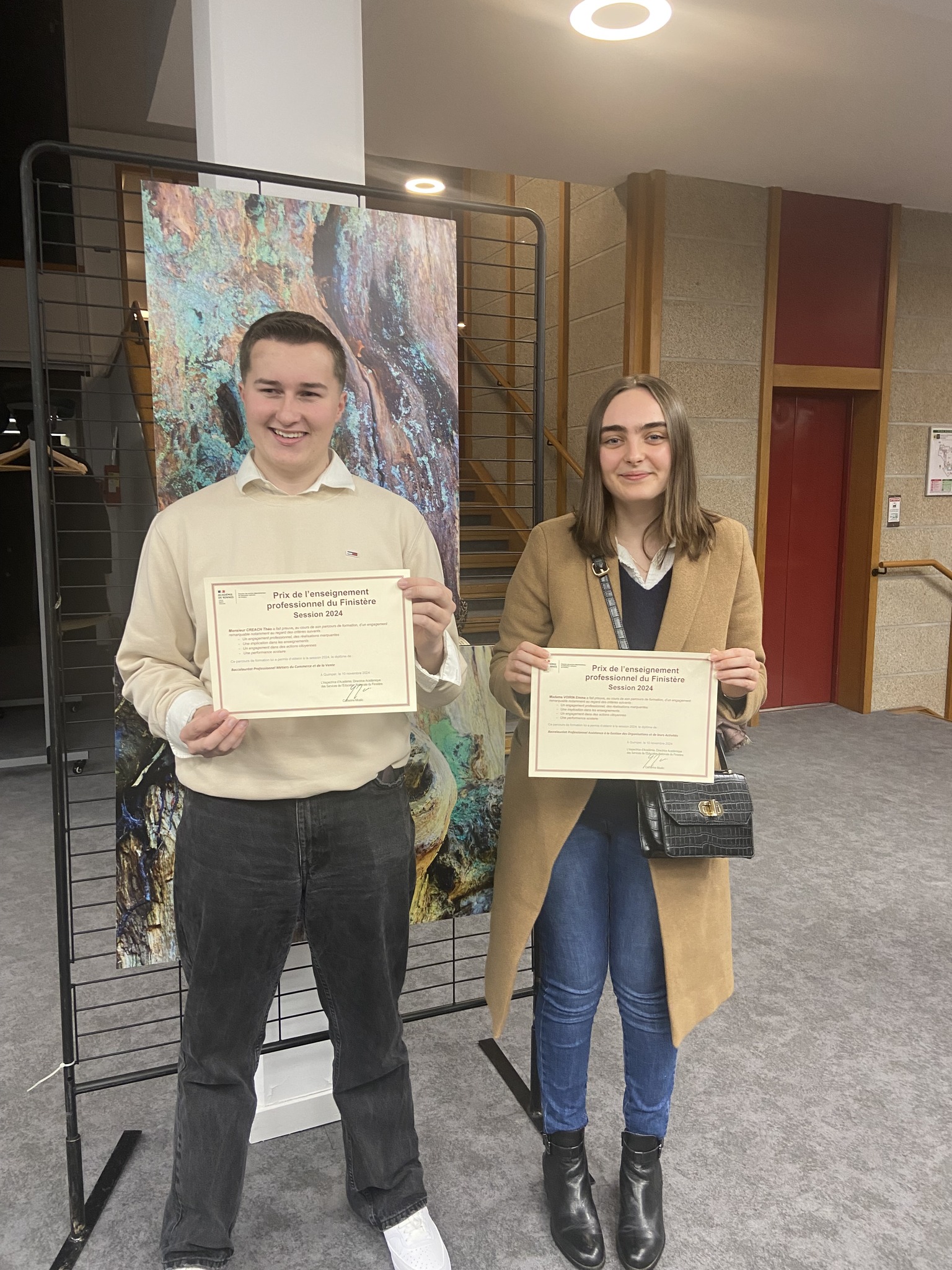 Lundi 25 novembre 2024, à la Maison du Département à Quimper, deux de nos anciens élèves, Théo CREACH et Emma VOIRIN, ont été mis à l’honneur lors de la Cérémonie de Valorisation de la Voie Professionnelle, organisée par l’AJE (Association Jeunesse et Entreprises).